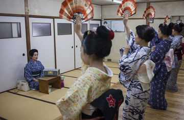 | Các Maiko đang được một Okasan dạy múa và hát truyền thống. |
