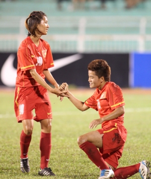 Trọng trách ghi bàn cho đội tuyển nữ Việt Nam được đặt lên vai 2 tiền đạo Nguyễn Thị Muôn và Nguyễn Thị Hòa.