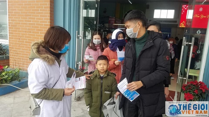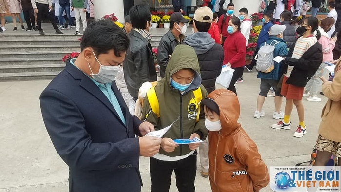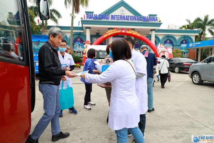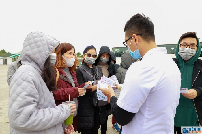 | Tại bến tầu du lịch Tuần Châu - Hạ Long cán bộ nhân viên Trung tâm Kiểm soát bệnh tật phát tờ rơi truyền thông về virus corona cho du khách đến thăm quan vịnh Hạ Long. |