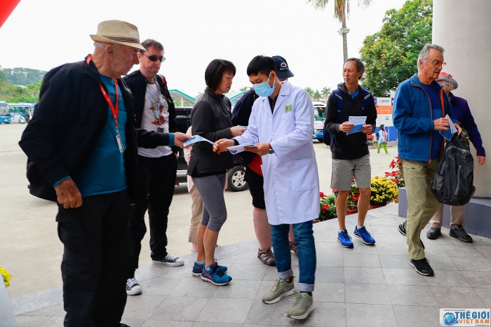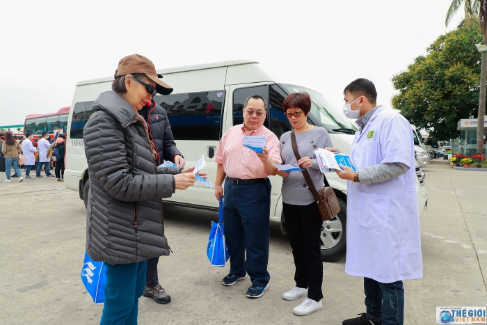 | Ngay khi xuống xe để vào thăm quan vịnh Hạ Long khách du lịch đã được phát tờ rơi truyền thông về virus corona. |