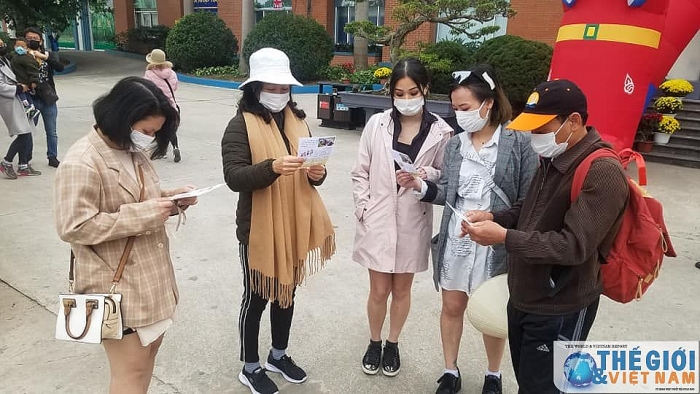 | Ngoài phát tờ rơi cán bộ nhân viên Trung tâm Kiểm soát bệnh tật còn truyền thông trực tiếp về virus corona mới đến du khách. |