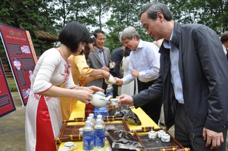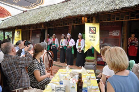 | Các vị khách thưởng thức các điệu dân ca truyền thống của người Mường. |