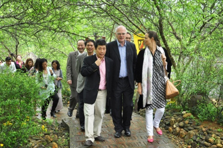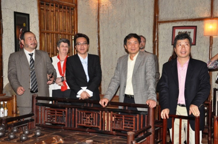 | Ông Trương Quốc Tiến (thứ hai từ trái) giới thiệu đón khách. |