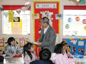 | Ông Hồng đang dạy học sinh tập đọc. Ảnh: Lê Thanh Hoàng |