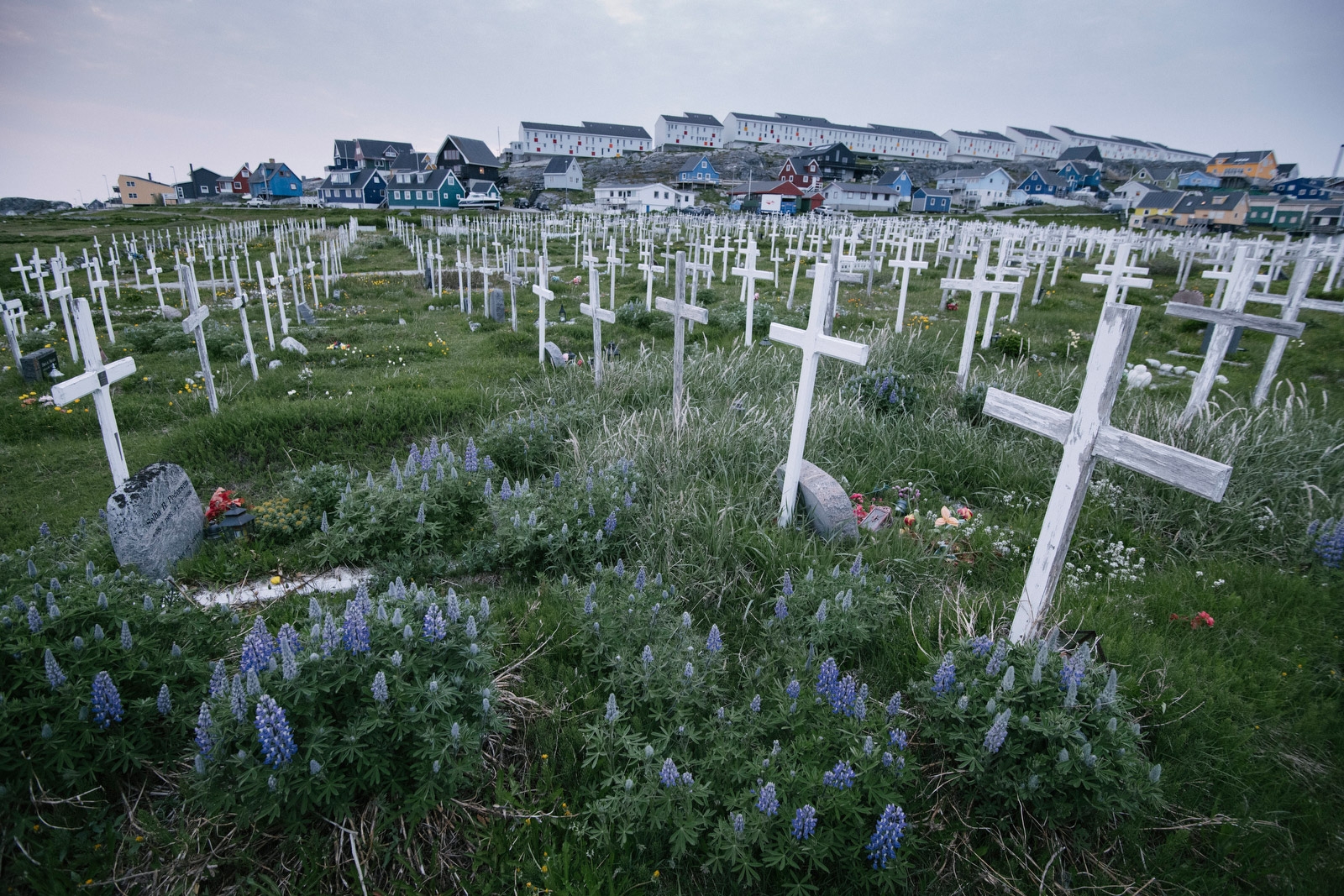 | Người dân Greenland chủ yếu theo Kito giáo. Trong ảnh là một nghĩa trang ở Nuuk với nhiều cây cỏ và hoa. |