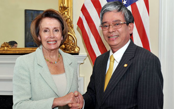 Tại buổi gặp, bà Nancy Pelosi bày tỏ đánh giá cao sự phát triển của quan hệ Đối tác toàn diện, cho rằng giữa hai bên có nhiều lợi ích tương đồng to lớn và nhiều tiềm năng để phát triển hơn nữa. Hạ Nghị sĩ Nancy Pelosi tin tưởng trên cơ sở của 20 năm quan hệ ngoại giao, hai nước sẽ tiếp tục đạt được các thành công mới, đáp ứng tốt hơn nữa kỳ vọng của mỗi bên và đóng góp cho hòa bình, ổn định ở trong khu vực châu Á-Thái Bình Dương và trên thế giới. Bà Nancy Pelosi cho biết rất mong đợi vào chuyến thăm Việt Nam sắp tới để tận mắt chứng kiến sự phát triển ấn tượng của Việt Nam về các mặt, cũng như trao đổi về các biện pháp tăng cường quan hệ giữa hai nước, nhất là đúng năm hai nước kỷ niệm 20 năm quan hệ.