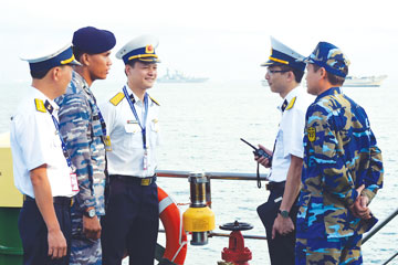 | Sĩ quan Hải quân Việt Nam và Indonesia trao đổi nghiệp vụ tại Diễn tập KOMODO 2014. (Ảnh: Trọng Thiết) |