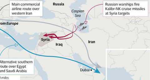 Hồi cuối tuần trước, EASA ra cảnh báo an toàn bay sau việc Nga phóng tên lửa từ tàu chiến ở biển Caspian nhằm chống lại “những phần tử khủng bố cực đoan” ở Syria. Khoảng cách từ nơi tàu chiến của Moscow tọa lạc tới mục tiêu ở Syria là gần 1.600km. Đường bay của tên lửa đi qua hành lang không phận giữa châu Âu, vùng Vịnh và châu Á khiến các nhà quan sát đưa ra cảnh báo đối với các hãng có phi cơ dân sự qua biển Caspian, Iran và Iraq.