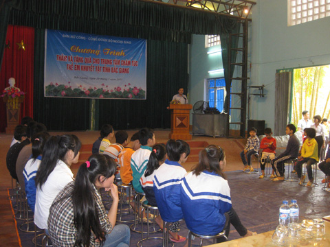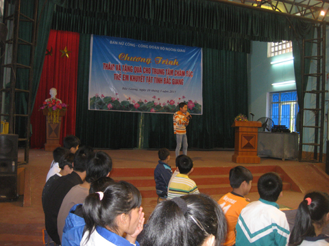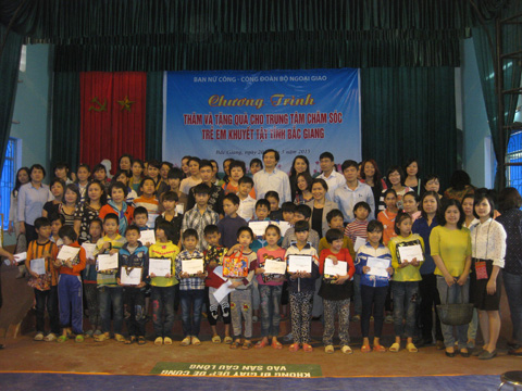 Rời chùa Vĩnh Nghiêm, qua thành phố khoảng 5km về phía Bắc, đoàn đến với Trung tâm chăm sóc trẻ em khuyết tật của tỉnh. Phát biểu tại buổi gặp gỡ với trung tâm, bà Ngô Thị Hòa, Vụ trưởng, Chánh thanh tra Bộ, Trưởng Ban Nữ công chia sẻ niềm vui khi được dẫn đầu đoàn nữ cán bộ Ngoại giao đến thăm, chăm sóc các cháu khuyết tật của tỉnh. Khi nghe kể về công tác giảng dạy và chăm sóc các cháu, mọi người thực sự rất xúc động.