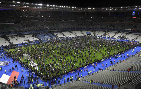 Cảnh sát đứng bên ngoài sân vận động Stade de France sau vụ nổ. Vụ nổ diễn ra khi đội tuyển quốc gia Pháp đang có trận đấu giao hữu với đội tuyển Đức. 80.000 khán giả có mặt trên khán đài, cùng với sự hiện diện Tổng thống nước chủ nhà Francois Hollande. (Nguồn: Reuters)
