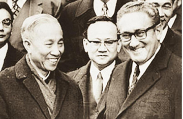 | Cố vấn đặc biệt Lê Đức Thọ, đại diện đoàn VNDCCH và Cố vấn đặc biệt của Tổng thống Hoa Kỳ Henry Kissinger chúc mừng nhau sau lễ ký tắt. |