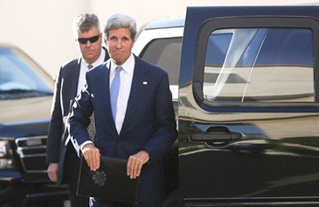 | Ngoại trưởng John Kerry đến thành phố Ramallah để gặp Tổng thống Palestine Mahmoud Abbas vào 18/7/2013. |
