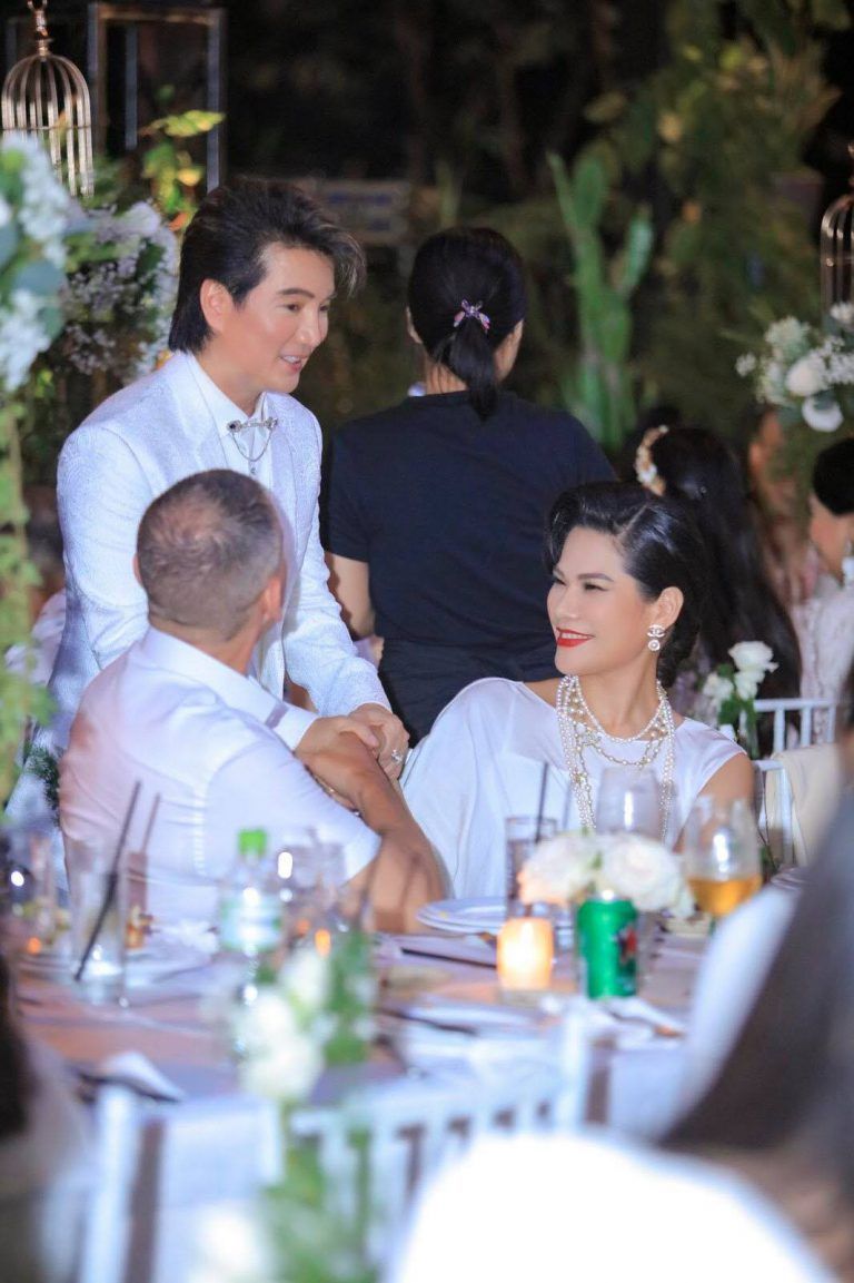 Có mặt tại tiệc sinh nhật khá sớm, vợ chồng hoa khôi Hương Hoàng gây ấn tượng với diện mạo sang trọng, thanh lịch. Cả hai đã gửi tặng nam ca sĩ những lời chúc tốt đẹp, thành công hơn trong chặng đường sự nghiệp.