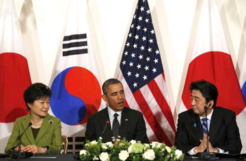 | Tổng thống Hàn Quốc Park Geun-hye, Tổng thống Mỹ Barack Obama và Thủ tướng Nhật Bản Shinzo Abe trong cuộc gặp cấp cao ba bên ở La Hay, ngày 25/3. |