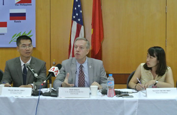 | Đại sứ Mỹ Ted Osius (giữa) tại cuộc họp báo ngày 28/7. Ảnh: D. Ngọc |