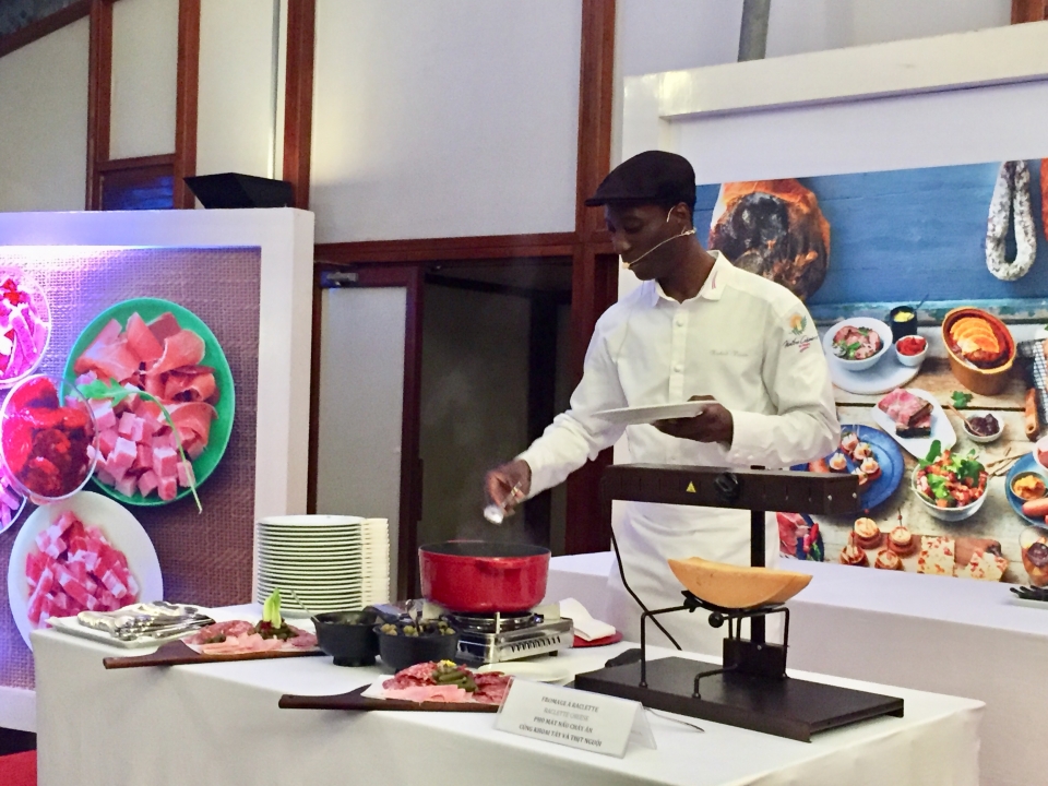 | Bếp trưởng đến từ khách sạn Sofitel Legend Metropole Hà Nội thực hiện món ăn đãi khách. |