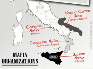 Hiện có 4 hệ thống mafia tồn tại trên đất Italy, tất cả đều ở miền Nam, là 'Ndranghetta ở vùng Calabria, Cosa Nostra ở đảo Sicilia, Camorra ở vùng Campania và Sacra Corona Unita ở vùng Puglia.
