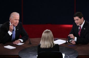 | Hai ứng viên Phó Tổng thống Mỹ, Joe Biden (trái) và Ryan, trong cuộc đối đầu duy nhất tối 11/10. |