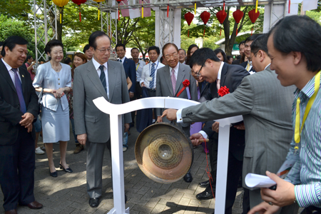 Bộ trưởng Phạm Bình Minh đánh cồng trước Ngôi nhà Việt Nam. |