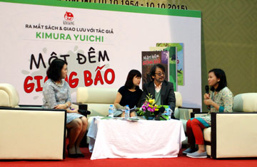 | Nhà văn Kimura Yuichi và nữ họa sĩ Thùy Cốm (ngoài cùng bên phải) trong buổi ra mắt bộ truyện Một đêm giông bão. |