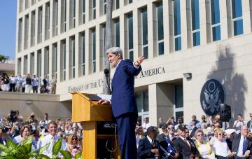 | Ngoại trưởng John Kerry đọc diễn văn tại buổi lễ thượng kỳ quốc gia ở Tòa Đại sứ Mỹ tại Thủ đô Havana. |