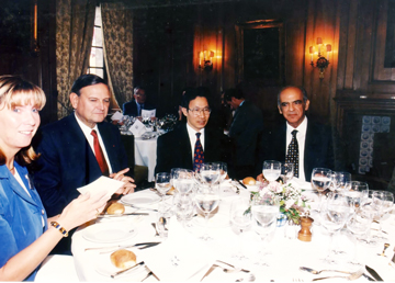 | Chủ tịch HĐTT OIF Trịnh Đức Dụ (thứ hai từ phải) tại tiệc chiêu đãi nhân Hội nghị quốc tế các thị trưởng thành phố nói tiếng Pháp tại Bỉ, năm 1997. |