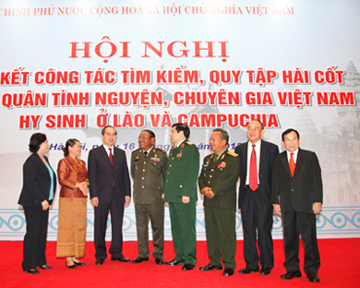 Ngày 16/10, tại Hà Nội, Chính phủ nước CHXHCN Việt Nam đã tổ chức Hội nghị Tổng kết công tác tìm kiếm, quy tập hài cốt liệt sỹ quân tình nguyện, chuyên gia Việt Nam hy sinh ở Lào và Campuchia. Phó Thủ tướng Chính phủ Nguyễn Thiện Nhân, Bộ trưởng Bộ Quốc phòng Đại tướng Phùng Quang Thanh, Bộ trưởng Bộ LĐTBXH Phạm Thị Hải Chuyền, Phó Thủ tướng Thường trực Chính phủ Hoàng gia Campuchia Men Som An, Trung tướng Chansamone Chanyalath, Thứ trưởng Bộ Quốc phòng nước CHDCND Lào đã tới dự.