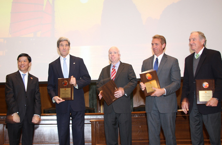 | Đại sứ Việt Nam tại Mỹ Nguyễn Quốc Cường trao tặng kỷ niệm chương cho Ngoại trưởng Mỹ John Kerry, Thượng nghị sỹ John McCain, Thượng nghị sỹ Jeff Flake, Thượng nghị sỹ Tom Harkin tại lễ kỷ niệm. (Ảnh: Quang Hòa/TTXVN) |