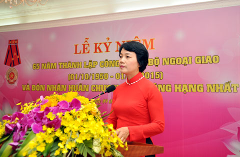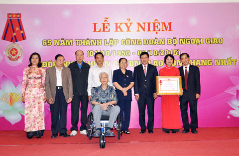 | Thay mặt Lãnh đạo Đảng và Nhà nước, Phó Thủ tướng, Bộ trưởng Ngoại giao Phạm Bình Minh trao tặng Huân chương Lao động Hạng Nhất cho Công đoàn Bộ. |