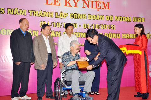 Phó Thủ tướng, Bộ trưởng Ngoại giao Phạm Bình Minh trao Kỷ niệm chương của Công đoàn Bộ cho ông Nguyễn Bá Bảo, nguyên Thư ký (Chủ tịch) Công đoàn Bộ đầu tiên, nhiệm kỳ 1950-1953.