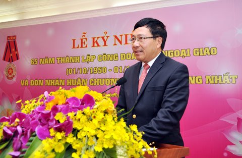 Nhiệt liệt chúc mừng những thành tích của Công đoàn Bộ đã đạt được trong 65 năm qua, Phó Thủ tướng, Bộ trưởng Phạm Bình Minh khẳng định, Công đoàn Bộ đã đồng hành và đóng góp vào những thành tựu vẻ vang của Ngành. Đó là sự cống hiến, nỗ lực đóng góp hết sức mình của các thế hệ cán bộ, đoàn viên của Bộ, dù là trong thời kỳ chiến tranh gian khổ, thời kỳ bao vây cấm vận với bao vất vả, hay thời kỳ đổi mới và hội nhập quốc tế với nhiều thách thức hiện nay.