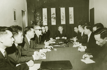 | Trưởng đoàn đàm phán Xuân Thủy (giữa) trong một cuộc họp nội bộ. * Ảnh do ông Trịnh Ngọc Thái (bên phải ông Xuân Thủy) cung cấp. |