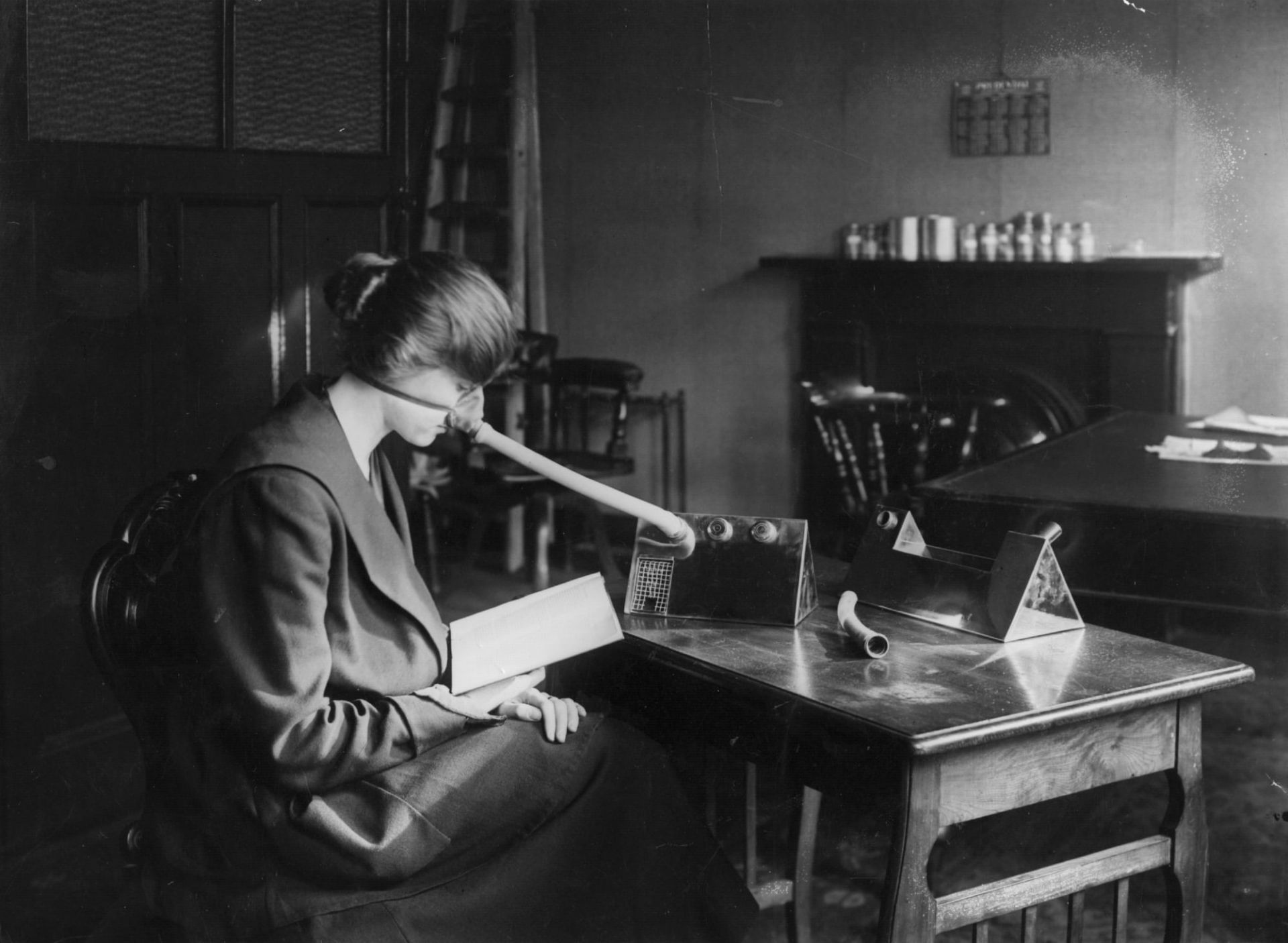 | Một người phụ nữ đeo "vòi cúm" được gắn vào 1 chiếc máy như hình ảnh trong những bộ phim khoa học viễn tưởng, năm 1919. Cho đến nay, người ta vẫn chưa rõ chiếc máy này hoạt động như thế nào hay có tác dụng gì trong việc bảo vệ sức khoẻ trước virus cúm. (Nguồn: Getty Images) |