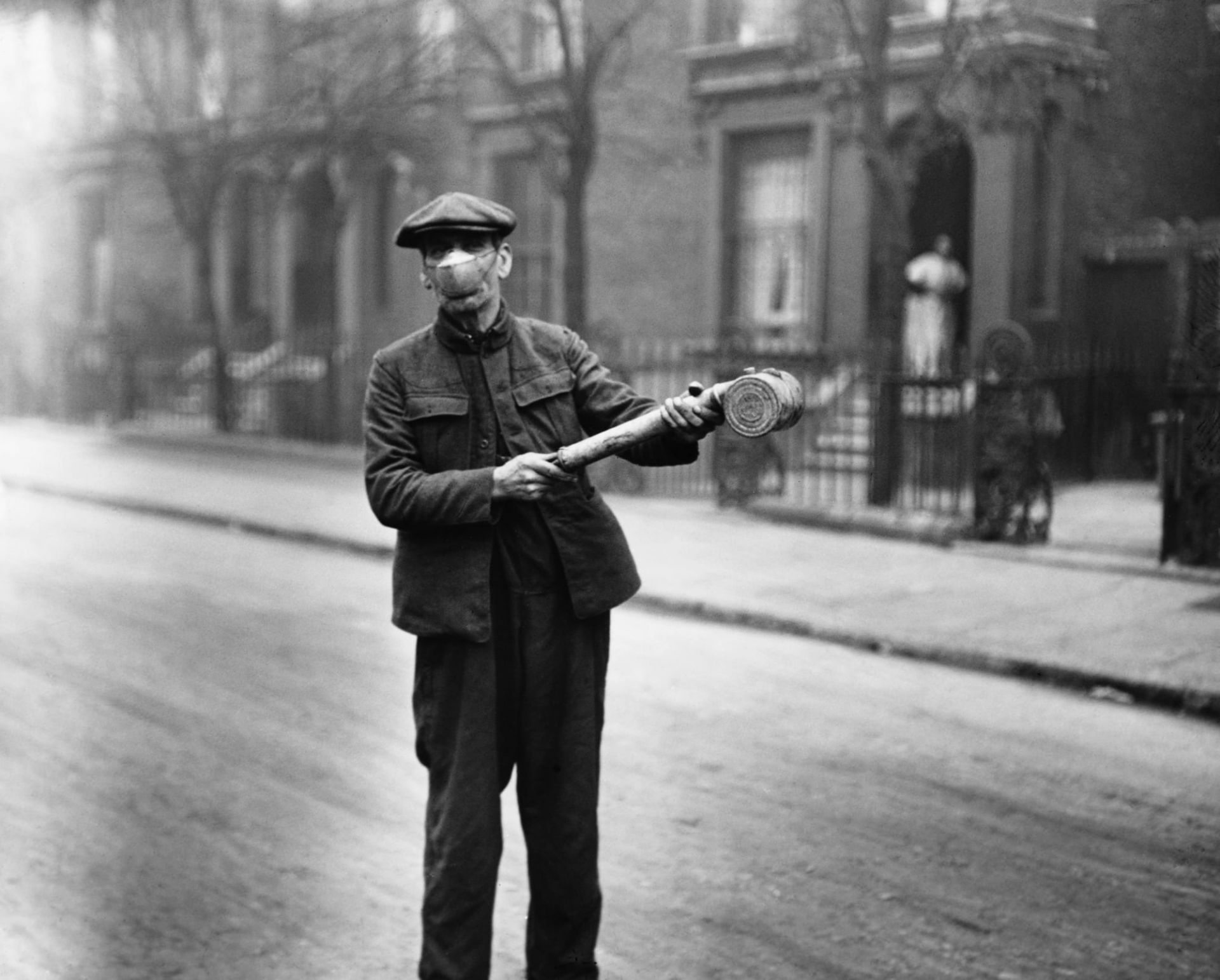 | Người đàn ông này đang đeo khẩu trang để phun thuốc khử trùng tại Vương quốc Anh, năm 1920. (Nguồn: Getty Images) |
