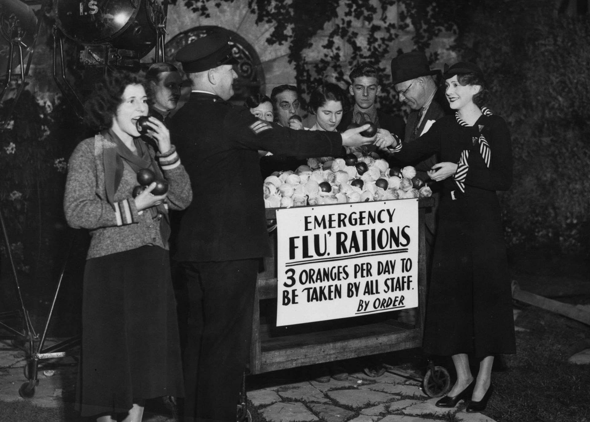 | Nữ diễn viên người Anh Molly Lamont (ngoài cùng bên trái) đang thưởng thức "khẩu phần" ngăn ngừa cúm khẩn cấp của mình: những trái cam. Bức ảnh được chụp tại Estree Studios ở London, năm 1940. (Nguồn: Getty Images) |