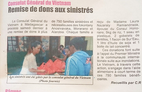 Đáp lại lời kêu gọi cứu trợ khẩn cấp của Chính phủ Madagascar, Lãnh sự danh dự Việt Nam tại Madagascar, ông Eric Andry Ramiandrasoa đã tổ chức hoạt động phân phát hàng cứu trợ cho 750 gia đình trong tổng số 5.000 người bị ảnh hưởng bởi lũ lụt tại các quận Alarobia, Anosivavaka và Morarano của Antananarivo. Hàng cứu trợ bao gồm nhu yếu phẩm cần thiết như gạo, dầu ăn, sữa, đồ hộp và vật dụng thiết yếu như thuốc lọc nước, xô nhựa đựng nước… Hoạt động nhân đạo và có ý nghĩa thiết thực này của Lãnh sự danh dự Việt Nam được chính quyền tại Madagascar đánh giá cao, góp phần tuyên truyền, quảng bá hình ảnh Việt Nam tại đảo quốc lớn nhất châu Phi này.