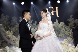 | Hoa hậu Đỗ Thị Hà đẹp tinh khôi tại tiệc cưới ở Hà Nội Tối 9/11, Hoa hậu Đỗ Thị Hà chuẩn bị 4 chiếc váy cưới hở vai trần trong hôn lễ cùng chú rể Nguyễn Viết Vương. |