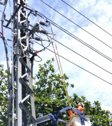 | Nhân viên Công ty Điện lực Quảng Ngãi ứng dụng công nghệ hotline (không cắt điện khi sửa chữa) tại khu công nghiệp Tịnh Phong. (Nguồn: Báo Quảng Ngãi) |