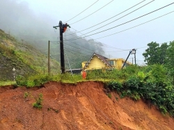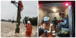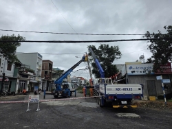 | Đoàn công tác Công ty Điện lực Quảng Ngãi đến hiện trường thăm hỏi, động viên cán bộ, công nhân viên Đội quản lý điện Sơn Hà đang khắc phục sự cố lưới điện, khôi phục cung cấp điện cho nhân dân. (Nguồn: PC Quảng Ngãi) |