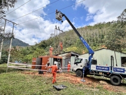| Nhân viên đội quản lý điện Nam Đông xử lý đường dây cấp điện chợ Khe Tre. (Nguồn: PC Huế) |