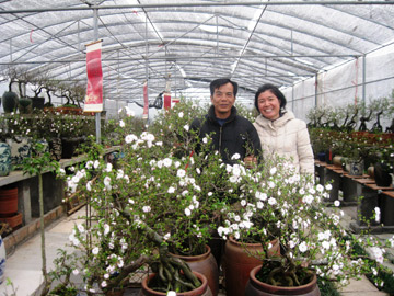 | Vợ chồng anh Sơn bên những cây mai ngày Tết. |
