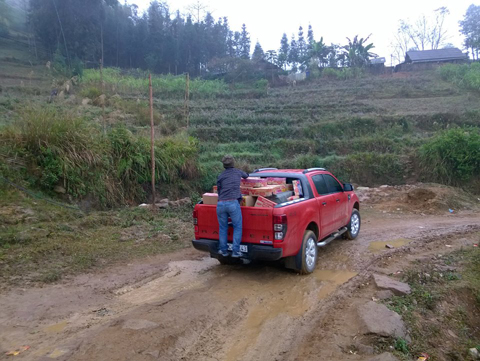 Xe chở hàng từ thiện phải đi qua những đoạn đường đất, dốc cao.