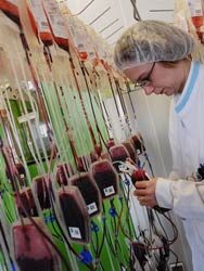 Trong phòng thí nghiệm các sản phẩm huyết học của Viện Máu Pháp tại Lille. Các bịch máu tiếp nhận từ người hiến máu sẽ được lọc, đóng gói và lưu trữ t