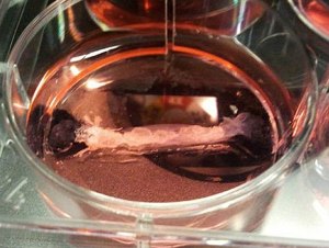 | Một mẫu thịt nhân tạo từ tế bào gốc trong phòng thí nghiệm. Ảnh: PA. |