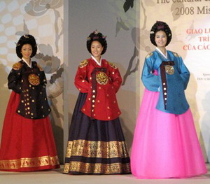 Tối qua (16/7) tại khách sạn Deawoo - Hà Nội, 52 người đẹp đang tham dự cuộc thi Hoa hậu Hàn Quốc 2008 đã có màn trình diễn Hanbok - trang phục truyền thống của phụ nữ Hàn Quốc.