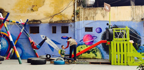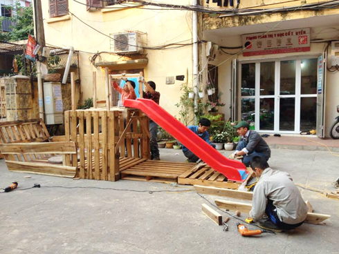 Dù chỉ mới 14h, nhưng những đứa trẻ tại khu tập thể Bộ Thủy sản (Nguyễn Công Hoan, Hà Nội) đã í ới rủ nhau ra chơi tại sân chung. Dưới bàn tay khéo léo của các bạn trẻ của nhóm Think Playgrounds (Nghĩ về Sân chơi), những vật liệu tưởng chừng bỏ đi đã được tạo thành chiếc cầu trượt hình con thuyền, xích đu, mặt nhún... khiến lũ trẻ mê mẩn. Người dân ở khu tập thể cho biết ngay khi mới chỉ hoàn thiện được 1/3 công đoạn, sân chơi này đã rất “ăn khách”. Thậm chí, có bé còn mải mê chơi ở đây đến... tối mới chịu về nhà.