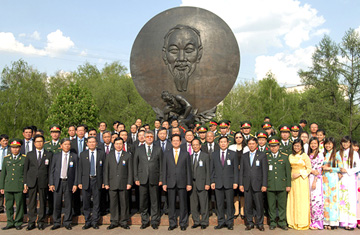 | Thủ tướng và Đoàn công tác cùng đại diện cán bộ ĐSQ nước ta tại Nga, đại diện cộng đồng người Việt ở Nga bên Tượng đài Bác Hồ ở Moscow. |