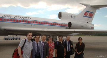 | Giáo sư Park Chan-Mo (thứ hai bên phải) cùng các nhà khoa học quốc tế đặt chân đến sân bay Bình Nhưỡng. |