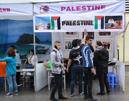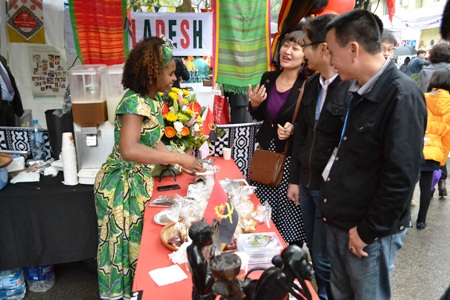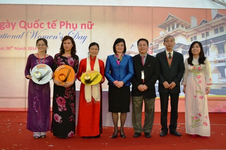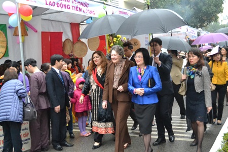 | Bà Nguyễn Nguyệt Nga, Phu nhân Phó Thủ tướng, Bộ trưởng Ngoại giao Phạm Bình Minh, Phu nhân các Đại sứ, Trưởng đại diện các tổ chức quốc tế tại Việt Nam cùng đi tham quan các gian hàng. |