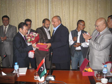 | Đại sứ Đào Duy Tiến nhận tặng phẩm lưu niệm của lãnh đạo Thành phố Benghazi cho Đoàn Việt Nam, tháng 4/2013. |